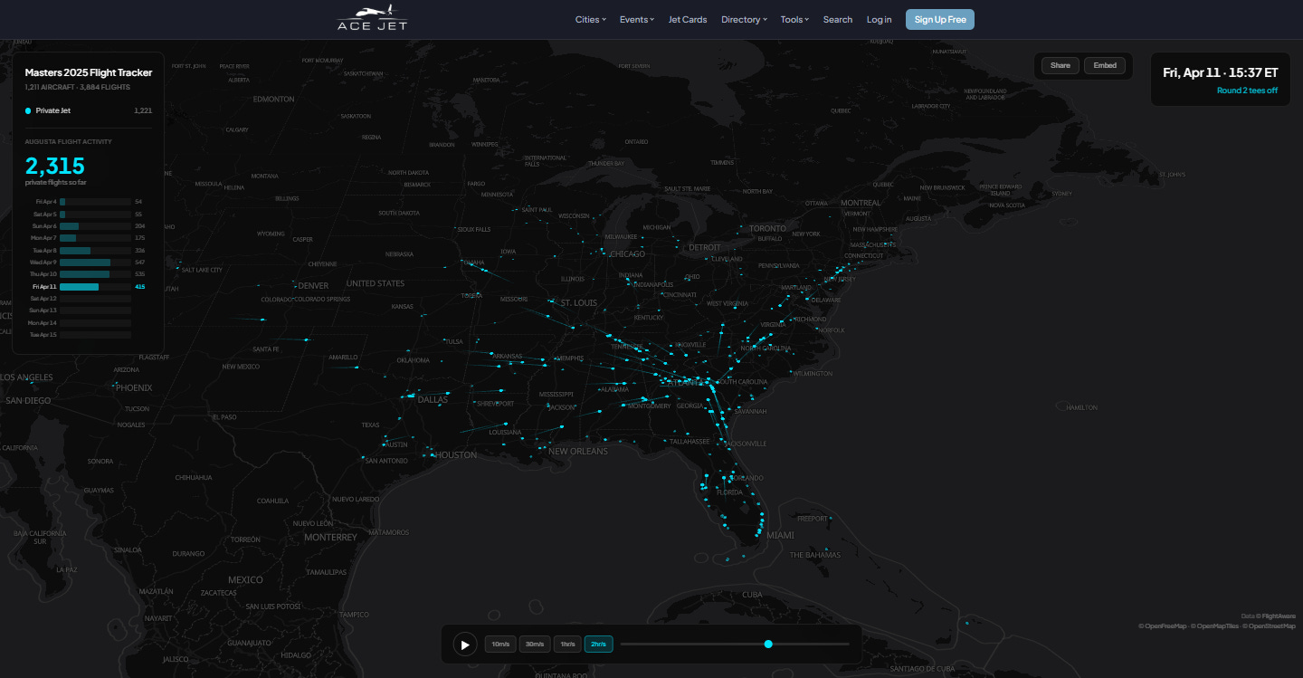 The result is one of the most concentrated private aviation events in the American sporting calendar. Last year, our friends at AceJet tracked every single private charter into Augusta Regional during Masters Week — and built an interactive flight tracker that visualises the full picture, animated on a tournament timeline with daily traffic data and aircraft category breakdowns.
